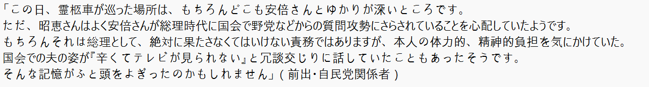 出棺は14時半過ぎ。昭恵さんは棺を乗せた霊柩車の助手席に座り、車は永田町の自民党本部、衆参議員会館、総理官邸と順に向かいました。安倍元首相の位牌を抱いた昭恵さんは憔悴した様子で、終始うつむいていたそうです。