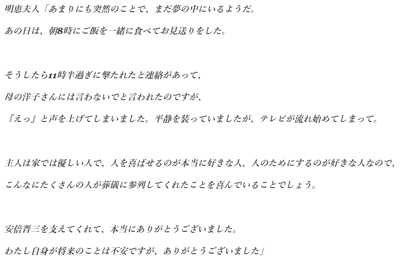 明恵夫人の様子について、泣きながら安倍元首相の御遺体に頬ずりし続けていたことも分かりました。