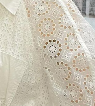 白のワンピースで一部がレースになっており、肌が透けて見える。清楚でありながら艶っぽさも感じる、おしゃれなワンピースですね。