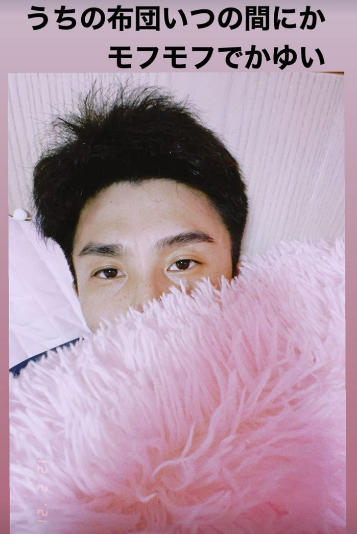 中尾さんは、「うちの布団いつの間にかモフモフでかゆい」と、ふわふわな毛布にくるまった写真を投稿。