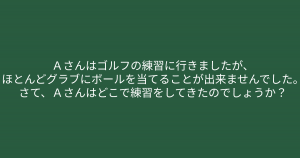 ”ほとんどグラブにボールを当てることが、、、” 問題文をよく読んで解いてみましょう 今回ご紹介するのは脳トレクイズです。 問題 Aさんはゴルフの練習に行きましたが、ほとんどグラブにボールを当てることが出来ませんでした。 さて、Aさんはどこで練習をしてきたのでしょうか? Google ADVERTISEMENT Google あなたはわかりましたか? それでは答え合わせに行きましょう! Google 答えは、、、「雨天練習場」 ADVERTISEMENT 「雨天練習場」だけに、上手く「打てん」かったのです。 Google あなたは間違えずに解けたでしょうか! ADVERTISEMENT Google [著作権者VONVON /無断コピー、無断転載および再配布禁止(違反時の法的措置)]