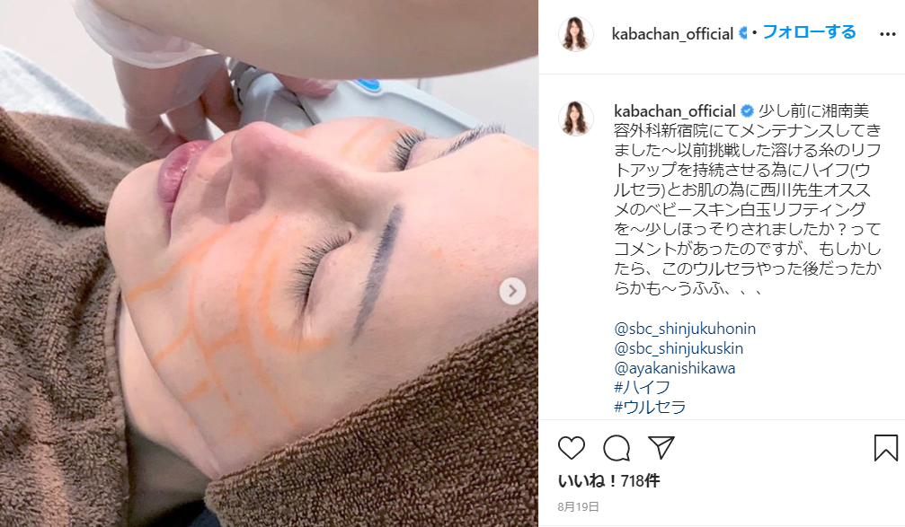 8月19日には美容外科で〝ベビースキン白玉リフティング〟というリフトアップ術を受けたと報告したKABA.ちゃん。インスタグラムにはビフォーアフター写真を公開していました!