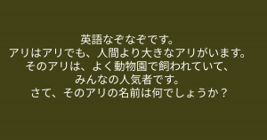 英語クイズなので、アリを英語にしてみましょう。すると「ant」になります。antが含まれている人間より大きな動物と言えば、「ゾウ(elephant)」なので、ゾウが答えになります。