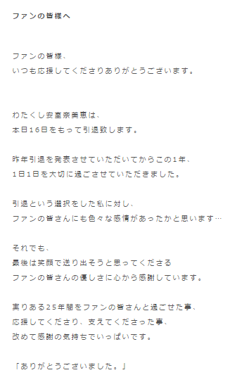 安室奈美恵は引退日である9月16日に公式ホームページにメッセージを残しました。「わたくし安室奈美恵は本日16日をもって引退致します。」「実りある25年間をファンの皆さんと過ごせた事、応援してくださり、支えてくださった事、改めて感謝の気持ちでいっぱいです。」といった文面が綴られており、思わず涙してしまいます。また、公式ホームページは9月30日でサービスを終了するとされています。