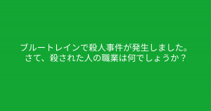 ”ブルートレインで○人事件が発生しました。” 問題文をよく読んで解いてみましょう 今回ご紹介するのは脳トレクイズです。 問題 ブルートレインで殺人事件が発生しました。 さて、殺された人の職業は何でしょうか? Google ADVERTISEMENT Google あなたはわかりましたか? それでは答え合わせに行きましょう! Google 答えは、、、「医師」 ADVERTISEMENT ブルートレインとは「寝台車」を指す愛称です。寝台車だけに「死んだ医者」となり、「医者」が殺されました。 ADVERTISEMENT Google あなたは間違えずに解けたでしょうか! Google [著作権者VONVON /無断コピー、無断転載および再配布禁止(違反時の法的措置) ADVERTISEMENT