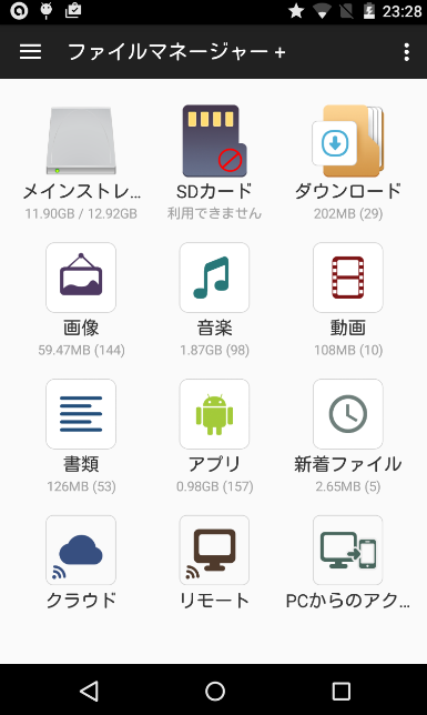 「ファイルマネージャー」アプリの機能をまとめると、本体またはSDカードに保存されているファイルやアプリを管理すること、パソコンから接続して本体内のファイルを操作すること、オンラインストレージやFTPなどのネットワーク上のドライブに接続してファイルの送受信を行うことです。「ファイルマネージャー」はAndroid端末でパソコンや外部のサーバーとの間でファイルを共有したり、パソコンと同じように作業をする場合に必須のアプリです。