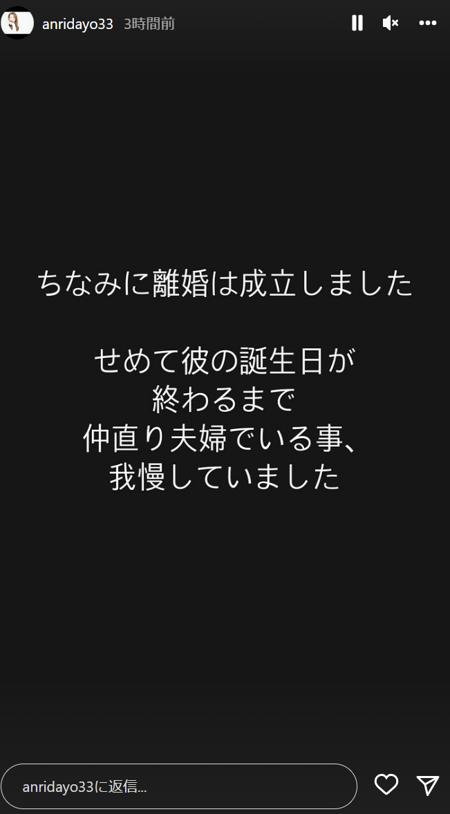 さらに「この妻のTPOを弁えられない下品さには僕はもう耐えられません。僕の仕事を理解出来ないようであれば離婚を選ぶしか他無いです。今までずっと黙って来ましたが 僕の堪忍袋の緒が切れました。これ以上は僕も限界です」と言及し離婚に同意している様子も。