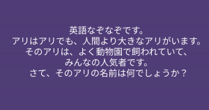 英語クイズなので、アリを英語にしてみましょう。すると「ant」になります。antが含まれている人間より大きな動物と言えば、「ゾウ(elephant)」なので、ゾウが答えになります。