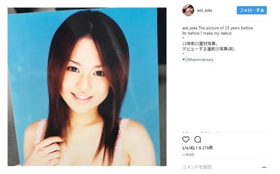 蒼井そらさんがなんと、約15年前の宣材写真をインスタに投稿したのです。それは、デビューする直前の写真だったのです。