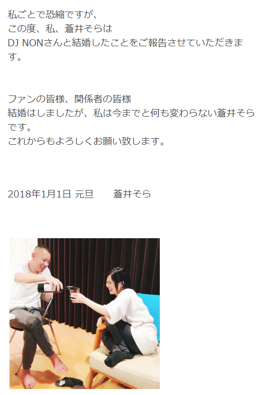 2018年1月2日、蒼井そらさんはDJ NONさんとの結婚を発表されたのです!