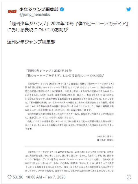 その上で「しかしながら、『悪の組織の医師』というキャラクターの設定とこれらの名前が合わさった結果、中国をはじめとする海外の読者の皆様に不快な思いをさせてしまいました。事前に編集部が表現について十全な検討を行うべきでした。深くお詫び申し上げます」