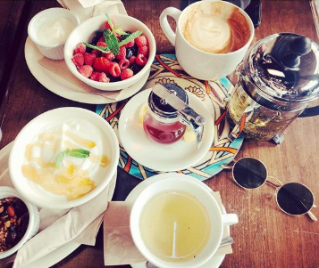 1枚目はコーヒーカップを手に持った自撮り写真、2枚目はヨーグルトやベリー、ナッツ類や飲み物など、テーブルの上に置かれた食べ物の写真。