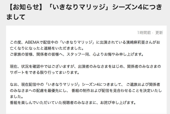 AbemaTVで放送のリアリティ番組「いきなりマリッジ」シーズン4に出演していた濱崎麻莉亜が8月26日に自宅マンションで亡くなった件について、その後の調査で当時の現場の状況や、彼女が亡くなった理由など、新事実が続々と明らかになったようです。どうやら部屋の鍵は開いていたようですが…