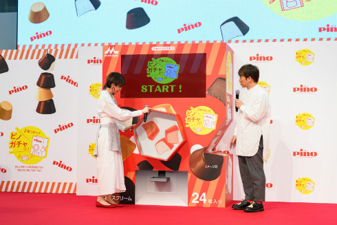 この日、「ピノ アソート(ピノガチャパッケージ)」シリーズの発売を記念したイベントに出席したお2人。イベントは対象のパッケージ2箱を使用すると、ピノ専用のガチャ「ピノガチャ」を作れるというもので、発表会では高さ2メートル以上の「巨大ピノガチャ」が登場しました。