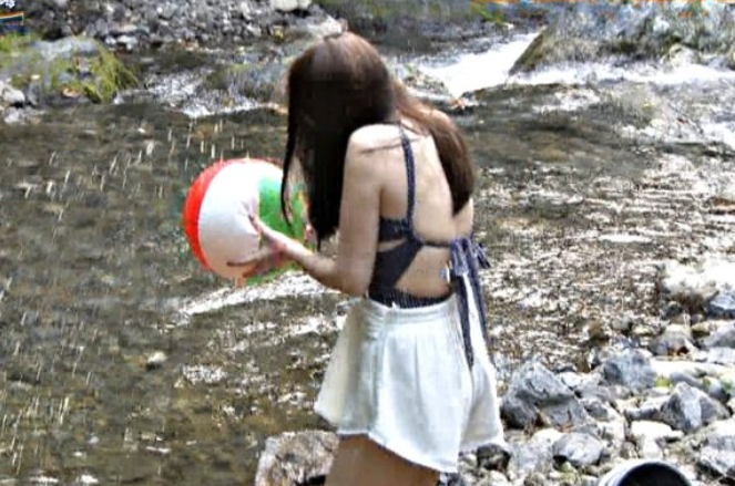 一同は水着に着替えて川辺で水遊び。水風船やウォーターガンでみちょぱ、丸山桂里奈さんらが水着でたわむれていると、小嶋さんが一足遅れて水着姿で登場しました。