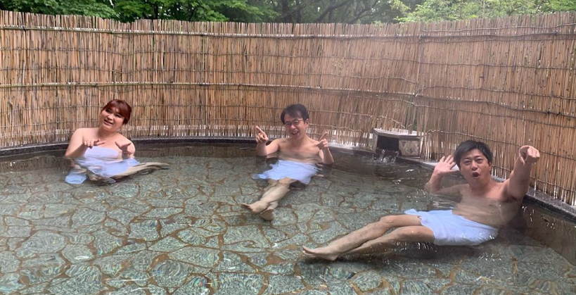 福澤朗と尾形貴弘は腰にバスタオルを巻いているのは対照的に、りんごちゃんは胸までバスタオルを巻いていますが、これには尾形貴弘も「色っぽいね。なんかやっぱり」と興奮している様子。福澤朗も「熟した女性と一緒にお風呂に入っている気分」と告白しました。