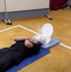 天井から吊るされた前後に揺れるバランスボールの下で、大野さんがそれを避けながら腹筋する動画がアップされていました。