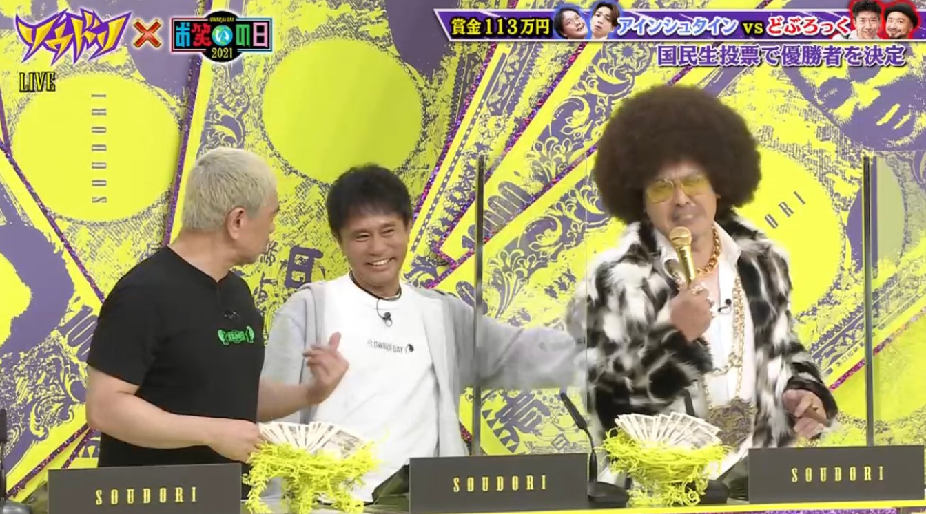 2日、有田さんは番組内のキャラクターであるドン・アリタとして、ダウンタウンの2人に「キング・マツモト」「ギャング・ハマダ」として呼びかけます。