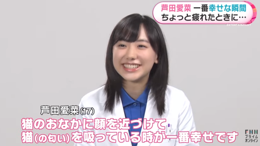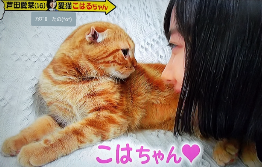 芦田さんが飼っている愛猫。猫のお腹に顔を近づけて猫(の匂い)を吸うことで日ごろの疲れを癒していると明かし、「ちょっと疲れたな」と思ったら猫を吸いに行くそうです。