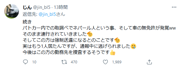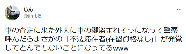 ツイ主のじんさんは車の査定をお願いしたところ、査定に来た人物の行動に危機感を感じたといいます。すぐに警察に通報し、警察官が駆け付けると“ある事実”が発覚。次々に捜査関係者が集まる事態になったんだとか。