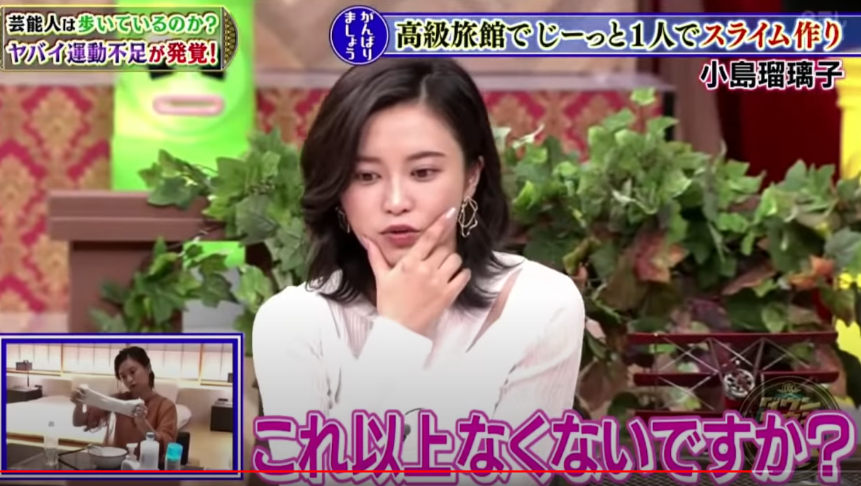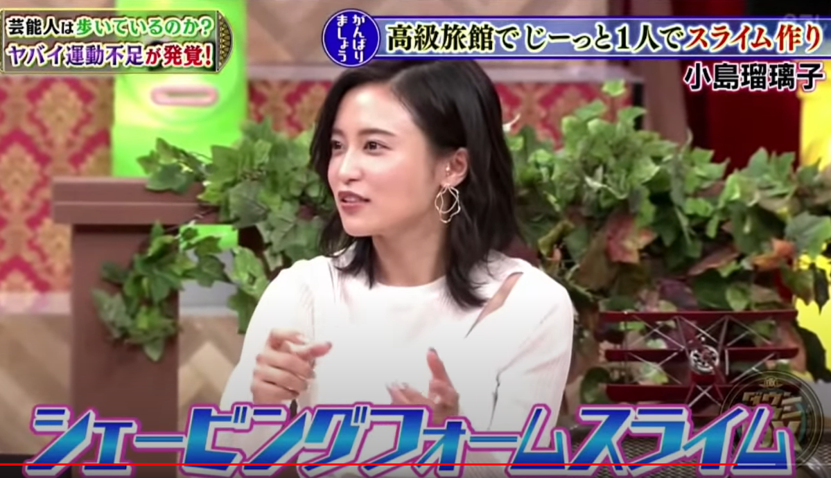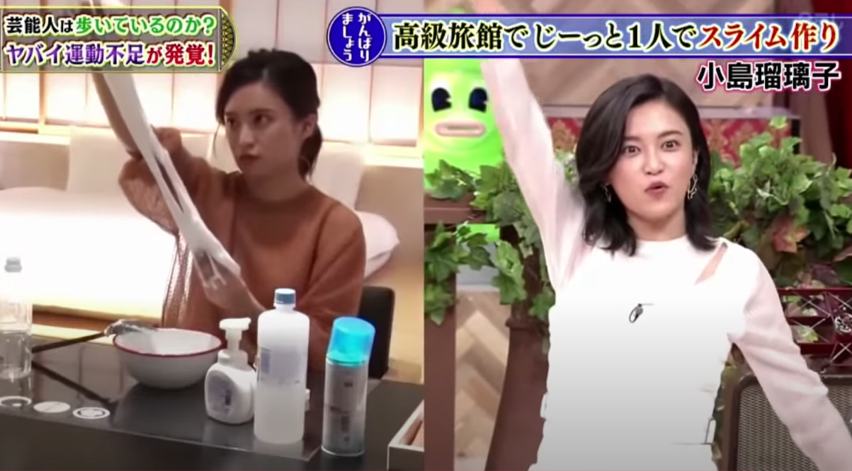 小島さんが作っていたのは なんとスライムだったのですが…⁉ VTRを見ていたスタジオはザワつき、『ハリセンボン』の近藤春菜さんも「ホテルで?」と 思わず驚いていました。そして、スライムが完成すると、小島さんは 「完璧…!」とうっとり。布団の上で寝転びながら「スライム」を伸ばしてみせたのでした。
