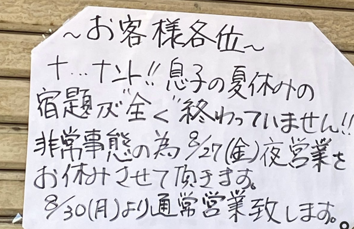 張り紙をよく見ると、「お客様各位」という書き出しに続き、「ナ…ナント!! 息子の夏休みの宿題が全く終わっていません!!」「非常事態のため8月27日夜営業をお休みさせて頂きます。8月30日より通常営業致します」という、衝撃的な告知文が書いてあったのです。