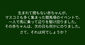 生まれて間もない赤ちゃんが、マスコミも多く集まった競馬場のイベントで、一人で馬に乗って辺りを駆け回りました。