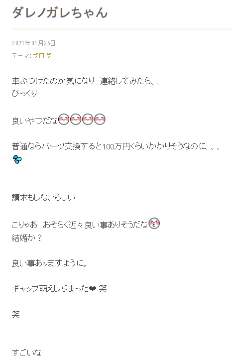 アレクさんは、このTwitterを見て 気になったそうで、ダレノガレさんに連絡したと報告。今回の投稿では、 「車ぶつけたのが気になり 連絡してみたら、、びっくり」「良いやつだな」とダレノガレさんの何かしらの対応に驚いた様子なのでした。