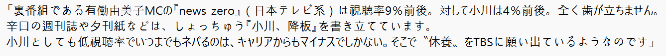 「小川としては加藤の末路を見ているだけに、先手を打ったのかもしれません。クビを切られる前に、自分から無期休養を願い出てクビを回避。その上で番組を自ら降りる。ここに小川なりの計算があるともっぱらです」と分析しています。