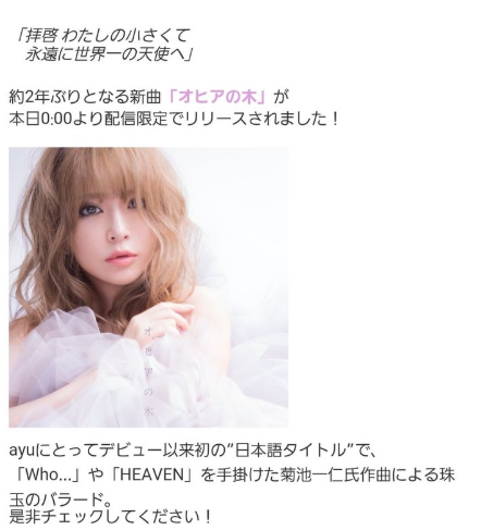7月5日、歌手の浜崎あゆみさんが自身のインスタグラムを更新。《New single『オヒアの木』たった今、配信スタートしました みんなが愛してくれてる『Who…』や『HEAVEN 』そして『SURREAL』でおなじみの、かず坊 @kazuhito_kikuchi との久々のタッグです》などとつづり、限定シングルの新曲『オヒアの木』をリリースしたことを報告しました!