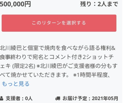 最も高額である50万円の場合、〝北川綾巴と個室で焼肉を食べながら語る権利&食事終わりで宛名とコメント付き2ショットチェキ〟とされていました。