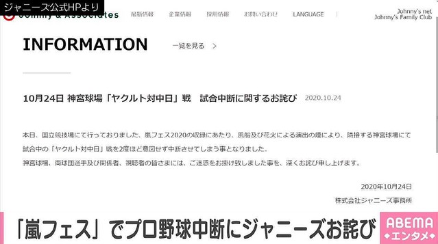 「本日、国立競技場にて行っておりました、嵐フェス2020の収録にあたり、風船及び花火による演出の煙により、隣接する神宮球場にて試合中の『ヤクルト対中日』戦を2度ほど意図せず中断させてしまう事となりました。神宮球場、両球団選手及び関係者、視聴者の皆さまには、ご迷惑をお掛け致しました事を、深くお詫び申し上げます」としました。