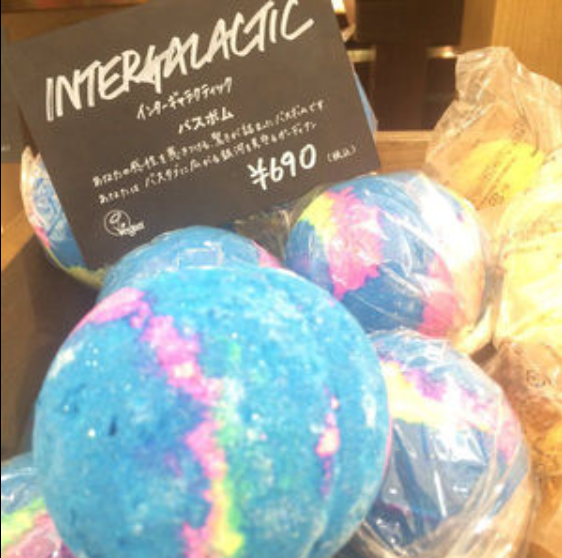 lushの入浴剤であるバスボム。このバスボムには種類が沢山あると書いたとおり、常にラインナップとして置かれているものや、期間限定で販売している入浴剤など色とりどりです。人気商品の中に「インターギャラクティック」という特に派手なバスボムがあります。この入浴剤はお風呂にいれるまで、”宇宙を漂う惑星”のような見た目をしているのですが、お風呂に入れるとその何層にも重なった入浴剤が一斉に溶け出し、紺~紫~青~ピンクといった色の泡が何層にも重なり、お風呂の表面には色鮮やかで幻想的な模様が生まれ、お風呂の中で宇宙空間を漂っているかのような体験ができます。