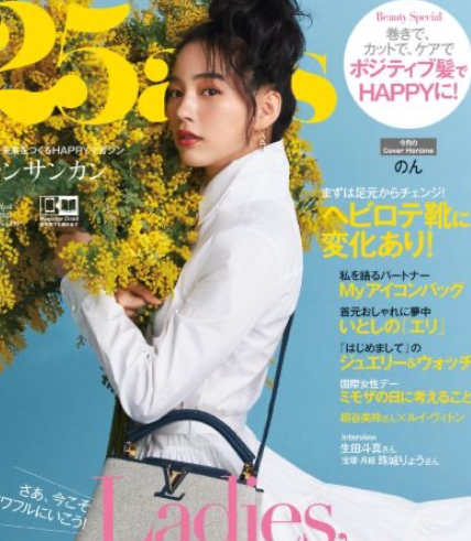 表紙に登場したのんは、髪をアップにしてルイ・ヴィトンの白いドレッシーなシャツワンピース、ショルダーバッグを斜め掛けし、ミモザの大きな花束を抱えながらカメラを見つめています。