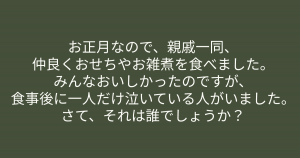 問題文に「みんなおいしかった」とあります。「皆、甥叱った」ので、「甥」は泣き出しました。