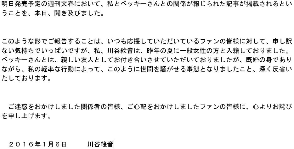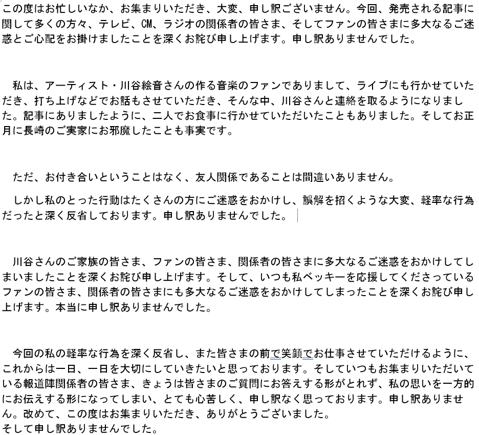 ベッキーの会見が終わった後、川谷はメディア各社にファクスでコメントを送りました。