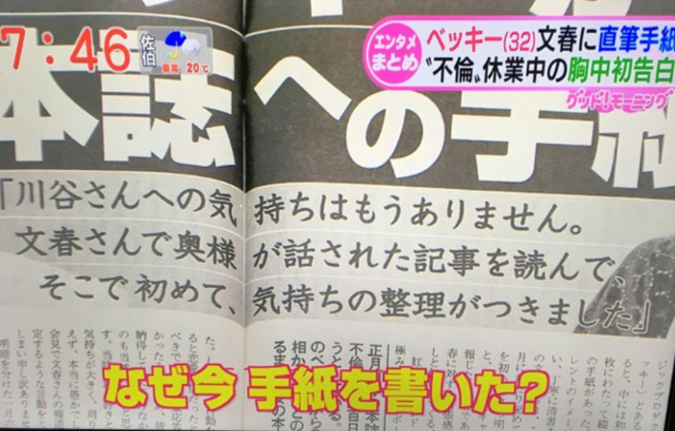ベッキー「週刊文春」に川谷さんと恋愛関係にあったことを認める内容の直筆の手紙を届けていました。