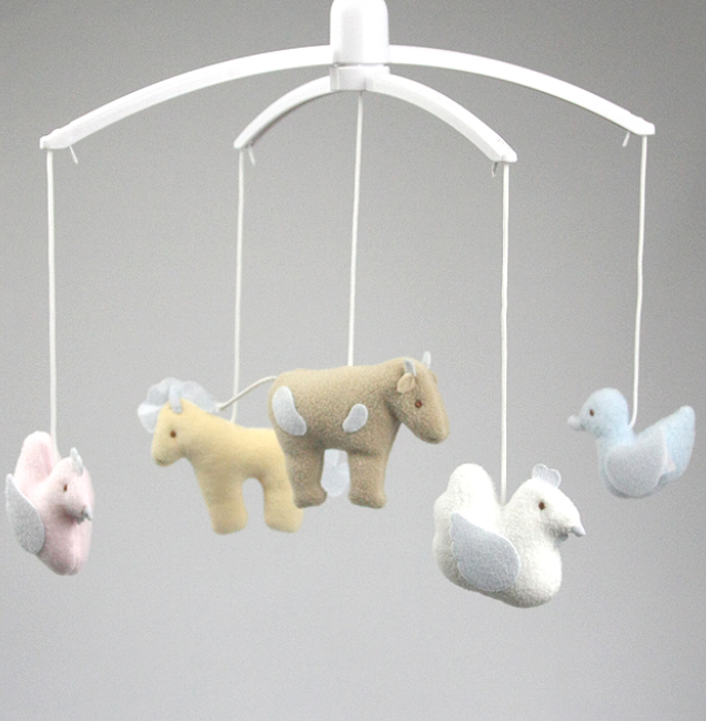 「ベッドメリー」とは簡単にいうと、オルゴールなどの優しい音色と、ベビーベッドの上でゆらゆら回るかわいい人形達が、赤ちゃんを優しくあやしてくれるオモチャなんです。赤ちゃんが産まれたら、何が必要なの?と悩みますよね。無駄にしたくないけれど、無さ過ぎるのもかわいそうかなと思ったり…。ベッドメリーは新生児から使用できて、視覚や聴覚に刺激を与えて脳の発達を促すといわれています。まだ体を思うように動かせない赤ちゃんにとって、オルゴールの優しい音色は聴覚の刺激になりますよね。そして、優しい音色でママも癒されるという優れものです。赤ちゃんの目が見えるようになると、かわいいモチーフのオモチャが頭上でクルクルと回るので、視覚も刺激されて知的好奇心を養うともいわれています。更に、赤ちゃんが手を動かせるようになったら、実際に触って遊ぶようにもなり、オモチャの取り外しができるタイプなら、新生児から成長に合わせて長く使えます。お財布にも優しいというわけです。