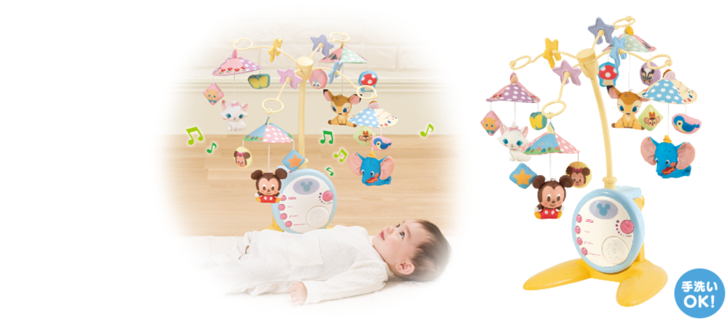 特徴(1)木製ベビーベッド&折りたたみベビーベッド&フロアの3WAY。(2)ぬいぐるみを取り外して遊べます。(3)胎内音など内臓メロディも増えてバリューアップ。(4)やわらかいイメージのデザインで、出産祝いなどの贈り物にもピッタリです。(5)優しい色合いとちょうど良いボリューム感。(6)かわいいディズニーキャラクターが組み替え自由で、赤ちゃんの好みを見ながらアレンジできます。■やさしいオルゴール音メロディ5曲…星に願いを/ミッキー・マウス・マーチ/ブラームスの子守唄/ゆりかごの歌/ミュージックボックス■やすらぐ環境音2種類…森の自然音/胎内音。メロディの選曲に鳥のさえずりや雨音の「森の自然音」が入っているのがとても良いですよね!眠くてぐずり始めた時に、母体の心音を聞かせると驚くほどぐずりが収まったという声もあるそうです。