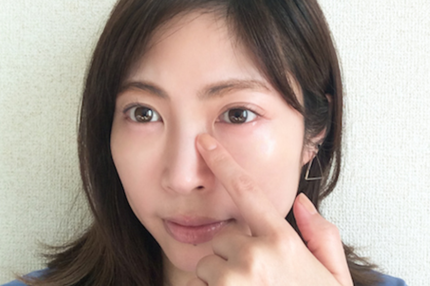 まず眉がしらの下から鼻筋に沿って、目の下あたりの高さまでシャドウを入れます。入れたら指でぼかすことが大切。ぼかし足りなくて、光線の加減でここの部分がクッキリ見えている人がいますよね。厚化粧に見えがちなので気をつけましょう。