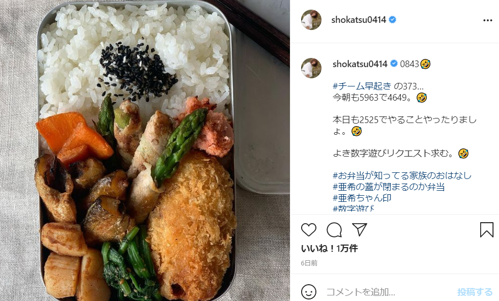 また、《カレンダーにしたら面白いか。まだまだあります。4649。よって、本日#寝起き悪かったけどリカバリー力高めで11874もできたから03510弁当 朝から失礼しました》と、ナゾの数字入り。