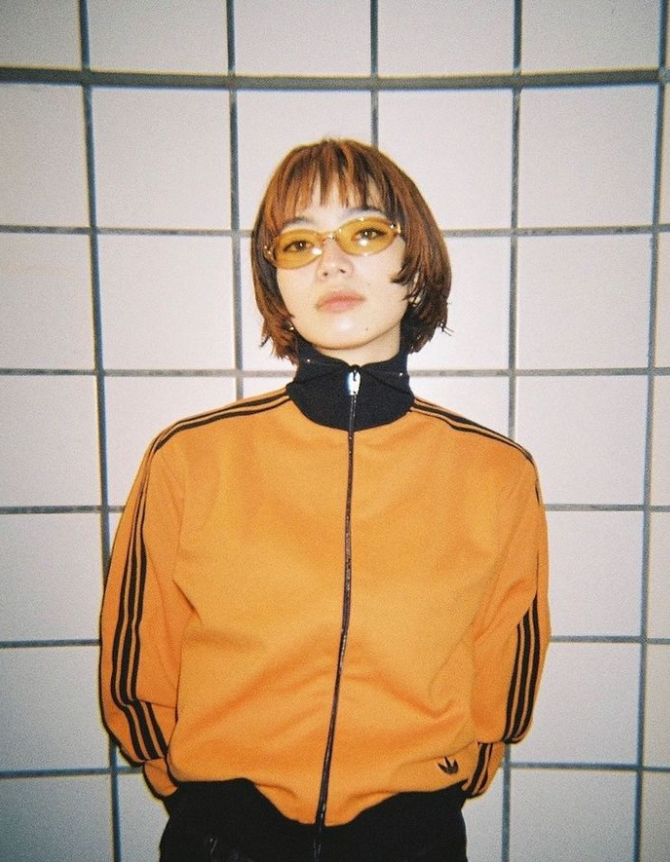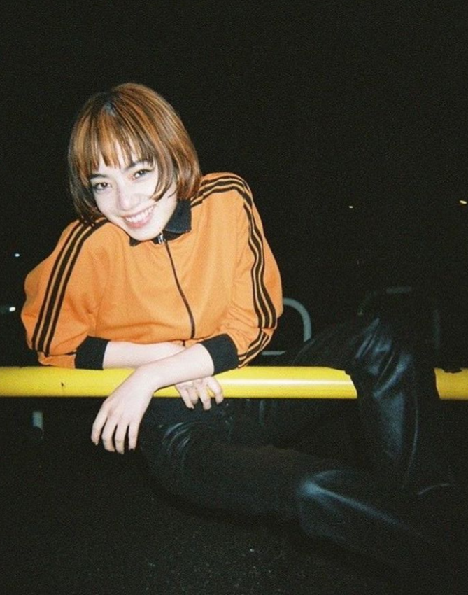 また写真に写る小松さんは、髪色に合わせたオレンジと黒のジャージに黒のレザーパンツを着用し、統一感のあるファッションを披露しています。