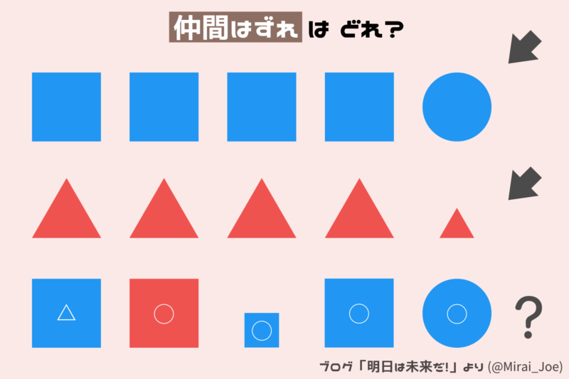 【脳トレ】頭をひねらないと絶対解けない図形問題!軽く考えてると間違えちゃうかも…? 今回ご紹介するのは脳トレクイズです。本日は、図形の問題! 一番下の列における「仲間はずれの図形」を探してください。その「理由」も一緒に考えてください。 あなたはわかるかな? Google Google ちょっとひねった問題です!よく考えてみましょう。 ADVERTISEMENT それでは答え合わせに行きましょう! Google 答えは、、、右から2番目の図形。 Google 実際にわかったあなたはIQが高いかも!? ADVERTISEMENT Google [著作権者VONVON /無断コピー、無断転載および再配布禁止(違反時の法的措置)]