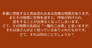多量に摂取すると死ぬ恐れのある危険な物質があります。またその物質に生物を浸すと、呼吸が妨げられ、息をすることが出来なくなってしまいます。