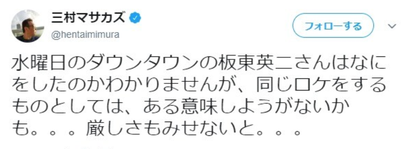 なお、三村は前述の『水ダウ』をテレビの前で視聴し、板東の暴行に対しては「(やりすぎる一般人には)厳しさもみせないと。。。」とTwitterでコメントを残していることが分かりました。