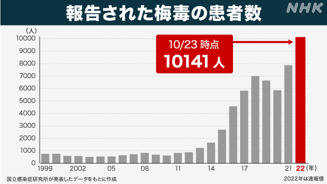 全国から報告された梅毒の感染者数は10月23日までに1万141人となり、現在の方法で統計を取り始めた1999年以降、初めて1万人を超えました。感染が拡大した背景には、ここ数年でよく聞く「パ●活」も関係しているのでは?と、デイリー新潮の記事で書かれています。