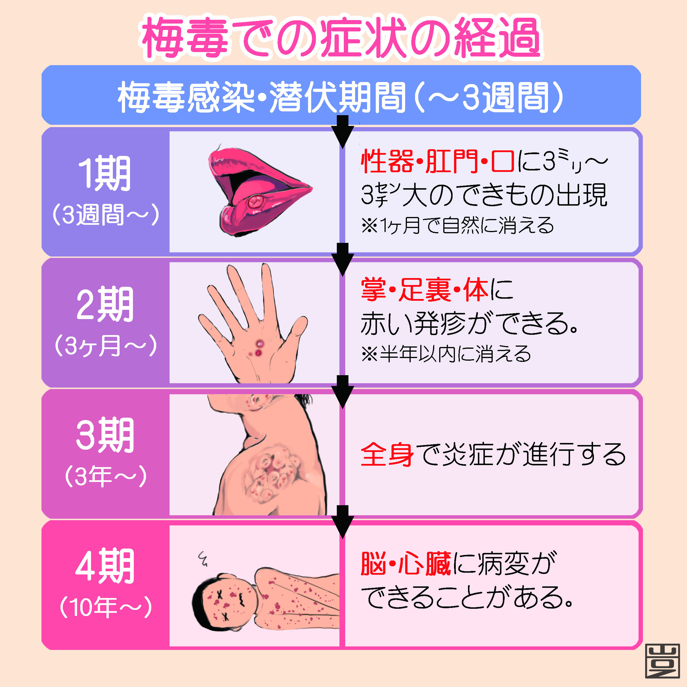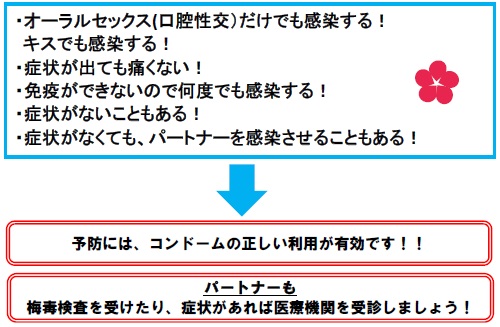 梅毒は細菌性の感染症で、主に男女の行為によって広がり、感染しても無症状だったり、症状が出てもすぐ消えたりすることがあり、気付かないうちに感染を広げている可能性も指摘されています。また、治療をせずに放置すると脳や心臓に深刻な症状が出ることもあるほか、妊婦が感染すると、死産や流産につながったり、赤ちゃんにさまざまな症状が出たりする恐れもあります。