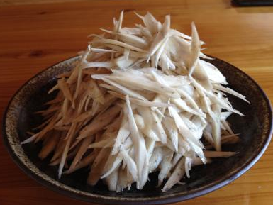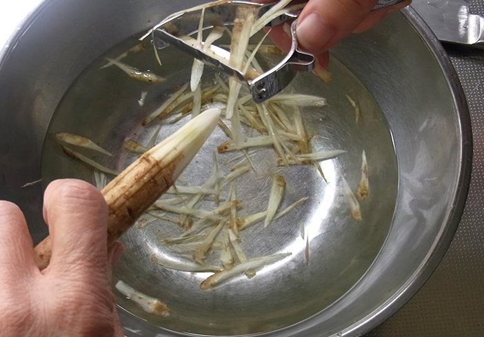 放鳥の場合、寝かせたり角度をつけたりすることで太さや厚みが異なってきます。薄くしたい時にはできる限り平行にして、太めにした時には少し角度をつけて切ります。包丁でささがきを作ると、時間はかかりますが手先の微妙な動きで厚さがバラバラになり、食べる時にアクセントとなります。ゴボウは切っていると途中からアクが出てきて黒くなるため、ボウルに水を張ってある程度切ったらそに入れておきます。一本分を切り終えると水が真っ黒になりますが、最後に1回水を変えてザルに上げて料理に使います。