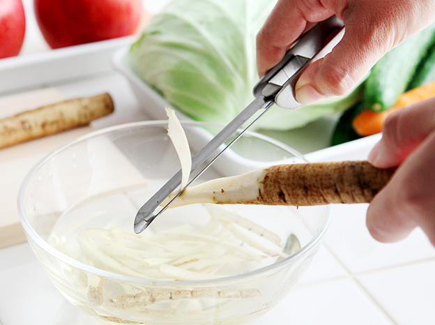 ささがきをするときには、太い方を利き手側にまな板の上に置きます。包丁やピーラーをゴボウと平行に左右に動かしながらそぐようにしていきます。ピーラーで行えば一定に薄く切ることができ、均等な厚さでささがきを作ることができます。とにかく早く食感にこだわりがなく時短したいという時にオススメです。包丁の場合は包丁を持った手を常に左右に動かしながらゴボウをコロコロ回して鉛筆のように先端を尖らせるような感じで切っていきます。