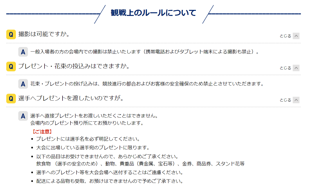 ”花束・プレゼントの投げ込みは、競技進行の都合およびお客様の安全確保のため禁止に…”とのこと。